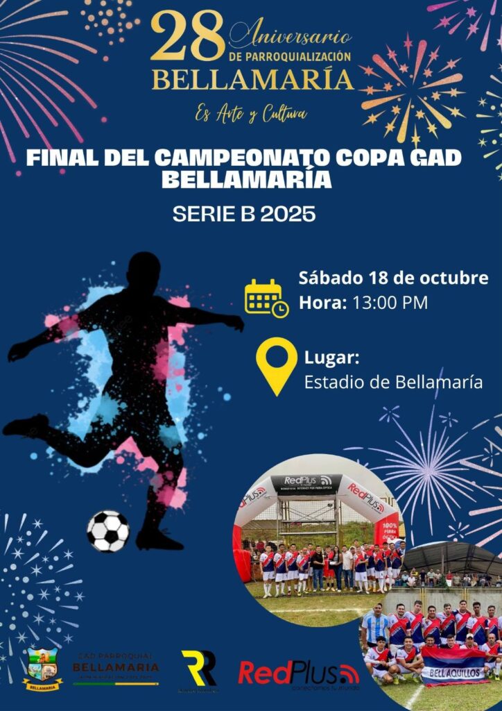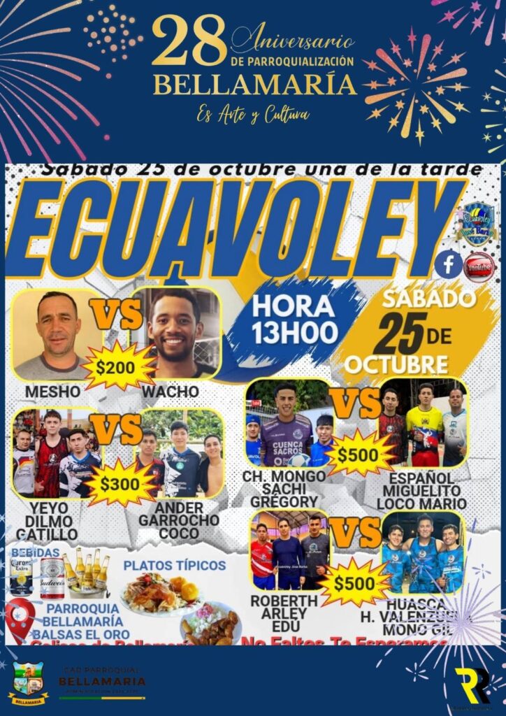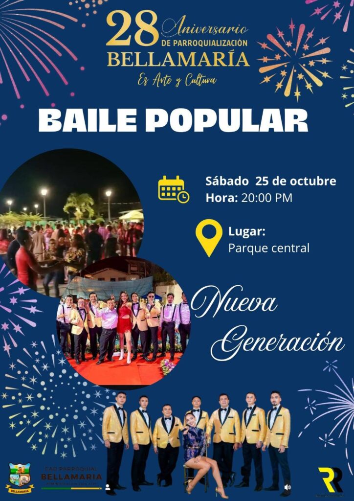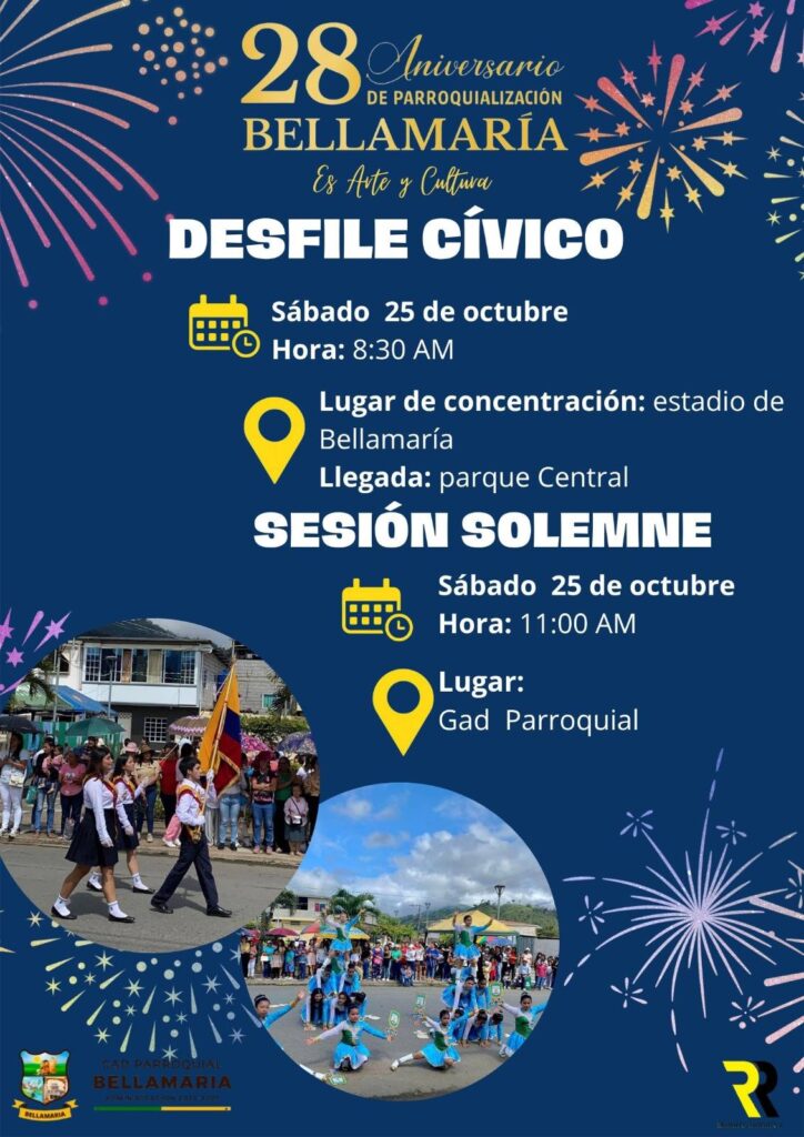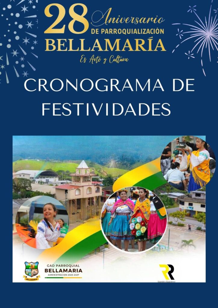El Gobierno Autónomo Descentralizado Parroquial de Bellamaría presenta a la ciudadanía el cronograma oficial de actividades programadas con motivo de la celebración del 28° aniversario de parroquialización de nuestra querida parroquia.